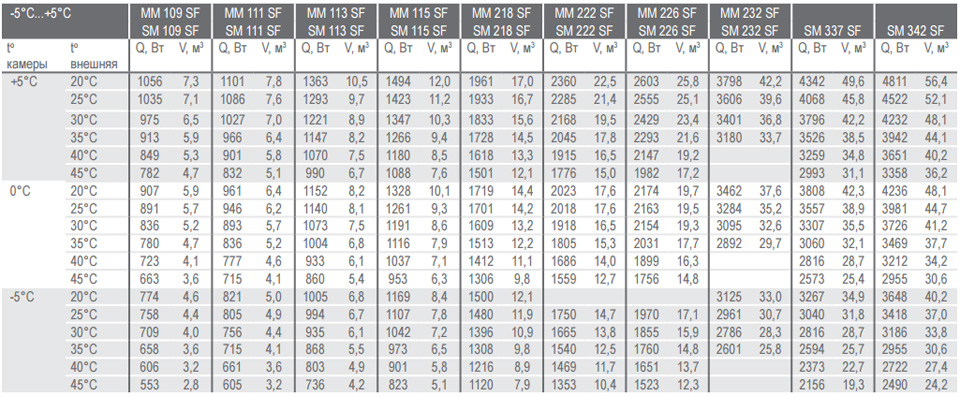 ТАБЛИЦА ПОДБОРА НИЗКОТЕМПЕРАТУРНЫХ ХОЛОДИЛЬНЫХ МАШИН POLAIR В ЗАВИСИМОСТИ ОТ ОБЪЕМА КАМЕРЫ