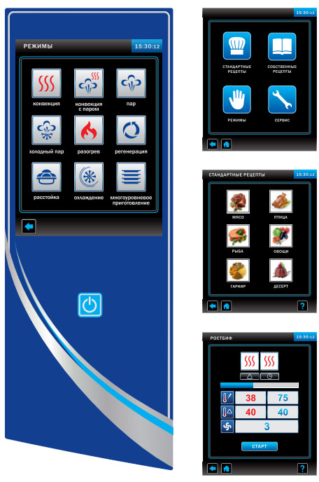 Несмотря на широчайшие функциональные возможности этих пароконвектоматов, управлять ими очень просто. Линейка пароконвектоматов имеет яркую, предельно информативную сенсорную панель управления высокого разрешения с индикацией на русском языке и подробной инструкцией.