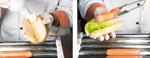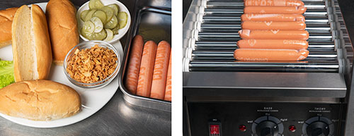 Разогрев сосисок для хот-догов может осуществляться при помощи различных грилей. Одна из самых удобных разновидностей — гриль роликовый, который позволяет быстро обжарить сосиски со всех сторон и поддерживать их в теплом состоянии для быстрой отдачи клиентам.