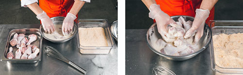 Куриное филе окунуть в льезон, затем в панировочную смесь.