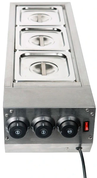 В комплект поставки входят 3 гастроемкости 1/6 с крышками, которые устанавливаются на керамические подогреватели, расположенные внутри корпуса.