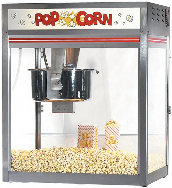 Попкорн аппарат настольный для заднего прилавка со стальным куполом, стойками корпуса из стали, электронным управлением нагрева, вытяжкой, системой автоматической подачи масла в котел.