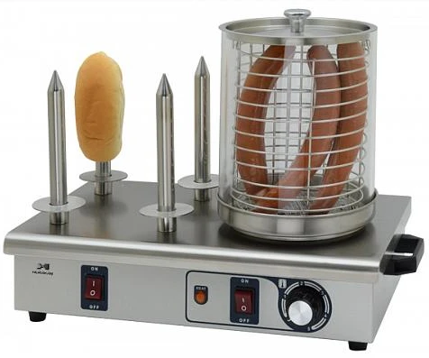 Модель оснащена паровой баней для варки и хранения в горячем виде сосисок, а также четырьмя нагреваемыми штырями для подогрева булочек изнутри.
