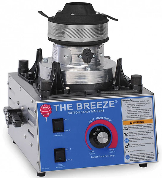 Аппарат для производства сахарной ваты Gold Medal Breeze имеет электромеханическую панель управления, угольные щетки, нагрев ТЭНом, корпус из нержавеющей стали, блокирующие ручки для транспортировки, неразборную головку, кожаные лепестки, фиксаторы для установки ловителя.