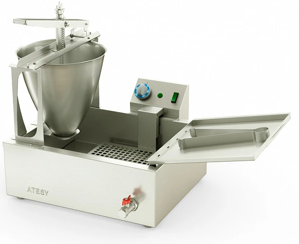 Аппарат состоит из фритюрной ванны, ручного дозатора теста, блока управления с электронагревателем и поддона для выкладки готовых пончиков.
