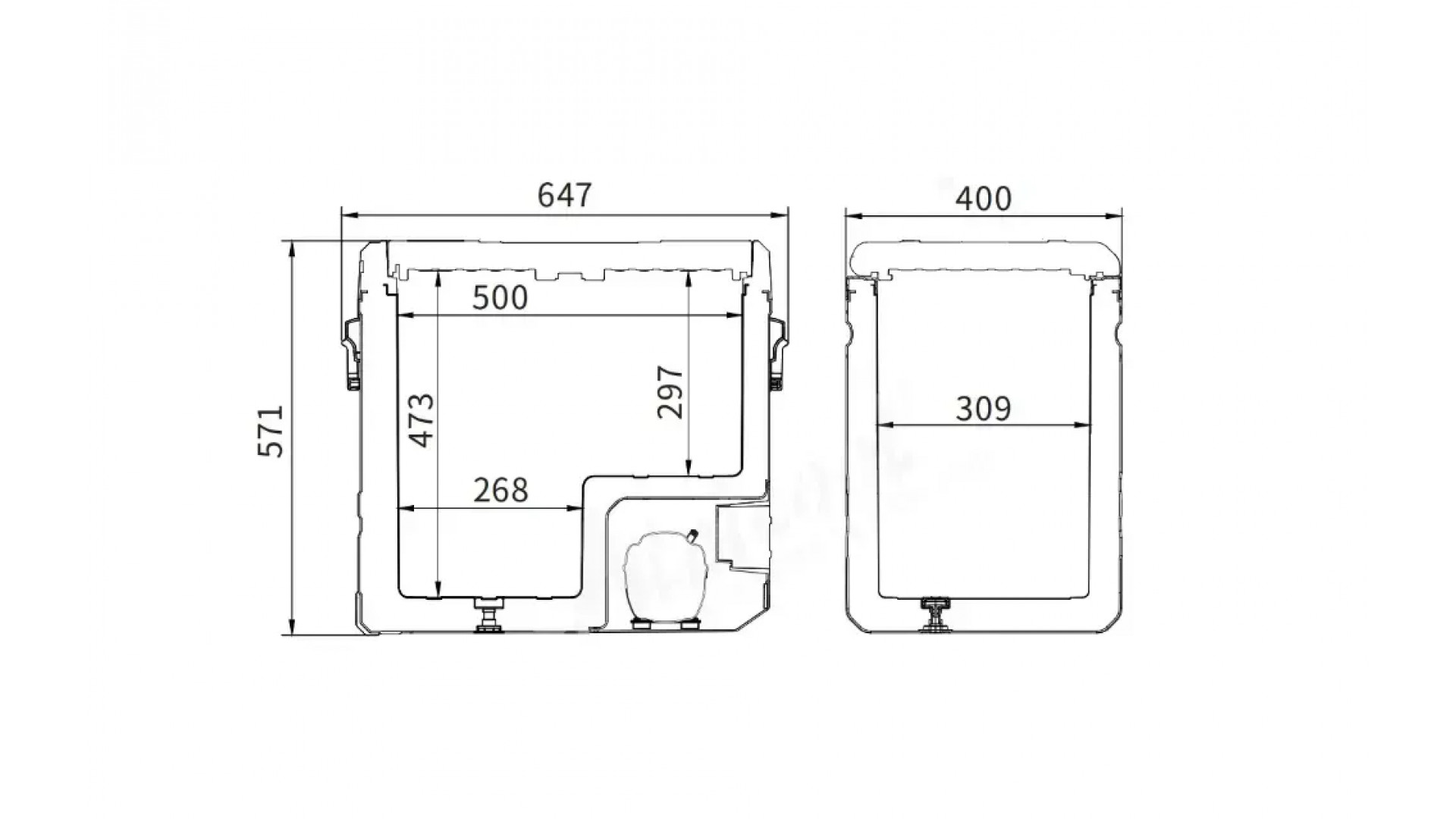 Внутренний объём в 60 литров подходит для длительных поездок: внутрь легко помещаются напитки, свежие продукты, полуфабрикаты и всё необходимое на несколько дней. Стенки гладкие, без лишних выступов — удобно мыть и не скапливается грязь. Для удобной очистки предусмотрена сливная пробка — после разморозки или мойки не нужно переворачивать холодильник: просто откройте заглушку, и вода уйдёт сама.