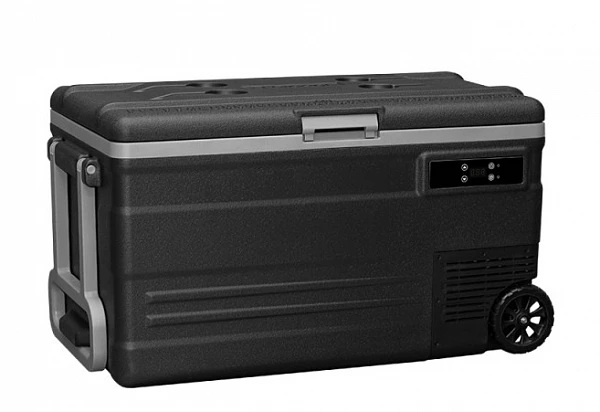 Автохолодильник имеет ручку и колёса для удобного перемещения.