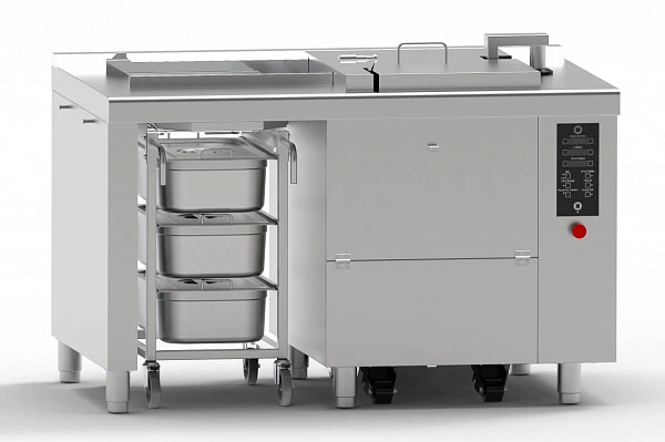 - Перфорированная корзина размером GN 2/1 с системой открытия днища, предохранительным стопором, изолированной ручкой на 4-х колесах из высококачественной нержавеющей стали