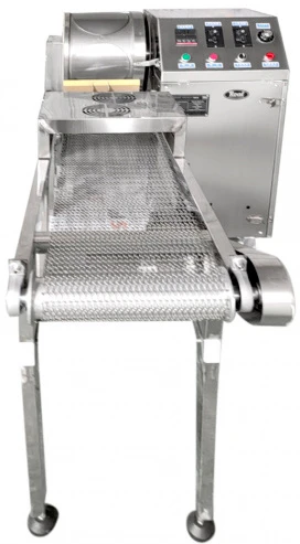 Принцип работы: тесто перекачивается насосом в специальный лоток, расположенный под барабаном выпечки. Поверхность барабана, касаясь тестовой массы, делает оборот и готовое изделие снимается на конвейерную ленту, где происходит их охлаждение с помощью вентилятора.