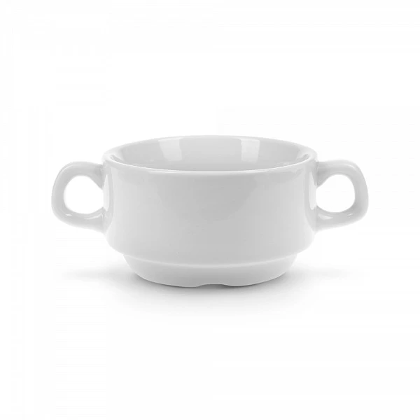 Бульонная чашка с двумя ручками выполнена из фарфора и покрыта белой глазурью. Ее можно греть в СВЧ-печи и мыть в посудомоечной машине.