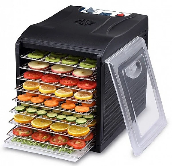 Дегидратор рассчитан на 9 уровней. Противни изготовлены из нержавеющей стали в виде сетки, что улучшает конечный результат. Они легко вытаскиваются и моются.