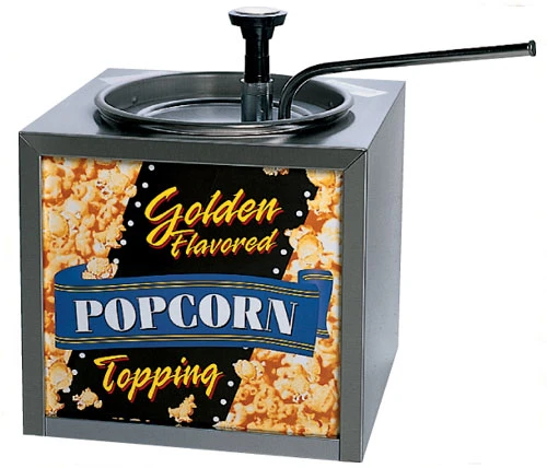 Диспенсер сливочного топпинга Gold Medal 2195EX настольный с насосом и чашей имеет подсвеченную цветную вывеску на передней панели. Рычаг подачи масла расположен вверху.