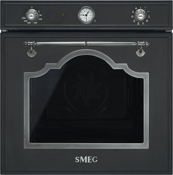 Работа модели Smeg SF750AS настраивается с помощью двух поворотных переключателей, выполненных под старинные вентили. Левый позволяет выставить уровень нагрева внутри рабочей камеры от 50 до 250 градусов, а правый — выбрать режим. Среди них: нижний, верхний + нижний, кольцевой, турбо, большой, малый гриль, конвекция, а также различные их сочетания. Выделяется энергосберегающий ECO режим, который задействует при выпекании гриль и традиционный нагрев. Предварительный разогрев не предназначен для приготовления, он помогает прибору быстро набрать нужную температуру.