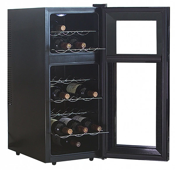 - Температура выставляется в каждой камере раздельно, что позволяет хранить одновременно красные и белые вина.