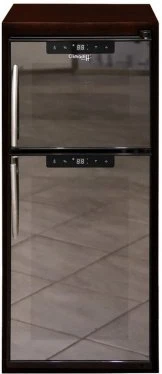 Двухзонный винный шкаф Climadiff Dopiovino (настольный/напольный) на 21 бутылку (типа Бордо) c деревянными полками, сенсорным управлением и деликатной светодиодной подсветкой белого цвета. Система охлаждения построена на основе принципа Пельтье (без компрессора, что полностью исключает вибрации). Дверь - зеркальный стеклопакет. Благодаря наличию двух отдельных зон имеется возможность задавать для каждой определённую температуру в зависимости от типа вина. Особенность данной модели - эффектный корпус из дерева, который может быть выполнен в любом цвете (тон - опция).