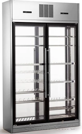 Корпус винотеки выполнен из полированной нержавеющей стали AISI 304, внутренняя камера цельная, на каждой стороне шкафа расположено по двое стеклянных дверей. Система внутреннего освещения выполнена на светодиодах, для обеспечения наилучшей презентации каждой бутылки вина со всех сторон.