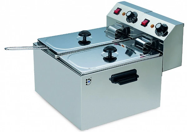 Фритюрница Gastrorag CZG-40-2 с 2 котлами емкостью 4 л предназначена для приготовления блюд в глубоком слое масла (во фритюре). Съемные блоки управления с ТЭНами и котлы делают очистку быстрой и удобной. Температура фритюра регулируется в пределах 110-190 °С. В комплект поставки входят 2 фритюрные корзины и 2 крышки. Для безопасности использования корзины фритюрницы оснащены термоизолированными ручками.