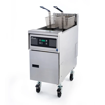 Фритюрница Pitco SFSE14X с автоматическим подъемом корзины. Одна ванна. Двухступенчатая система фильтрации, что позволяет увеличивать интервалы между заменами масла. Электронное управление с цифровым контроллером. Система предупредит о низком уровне масла и необходимости менять фильтр, фиксирует количество часов работы на одном масле, позволяет устанавливать время и температуру. Все компоненты оборудования, включая нагревательный элемент, находятся спереди. Это облегчает обслуживание.