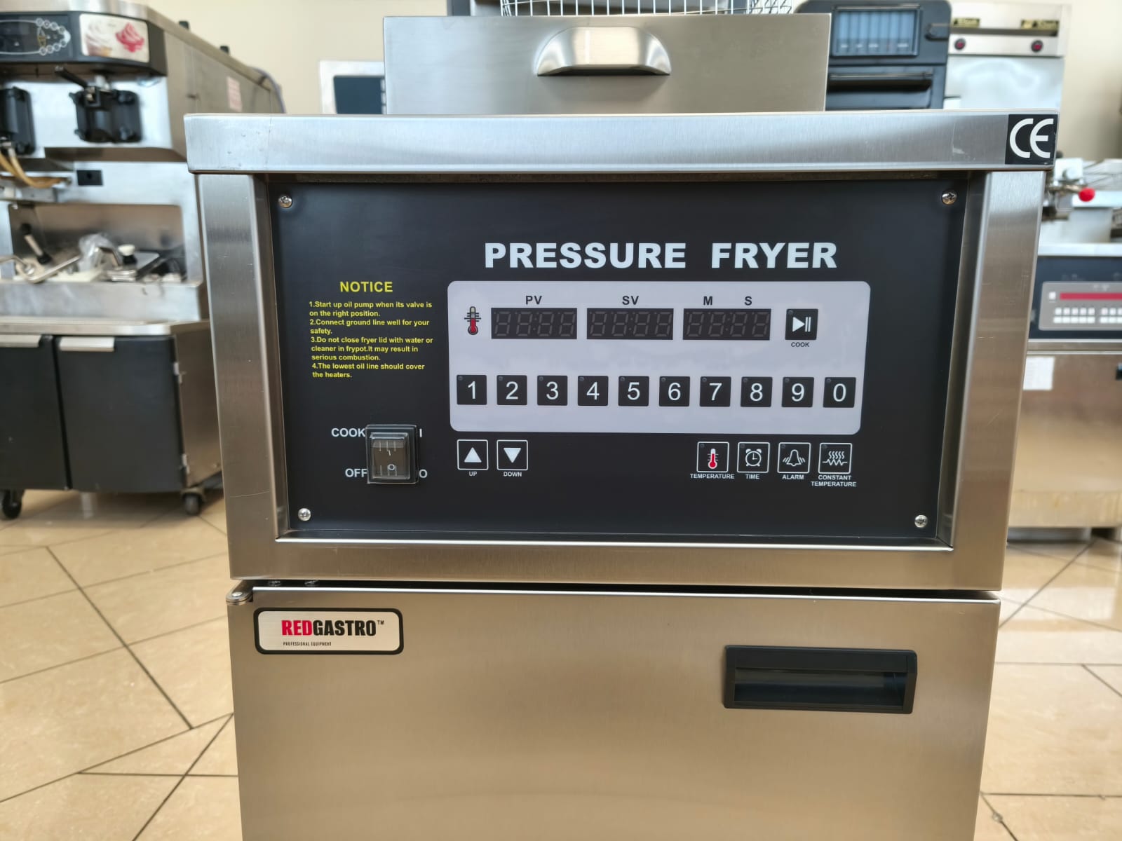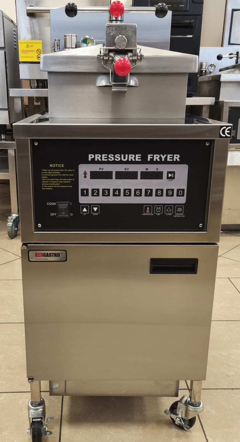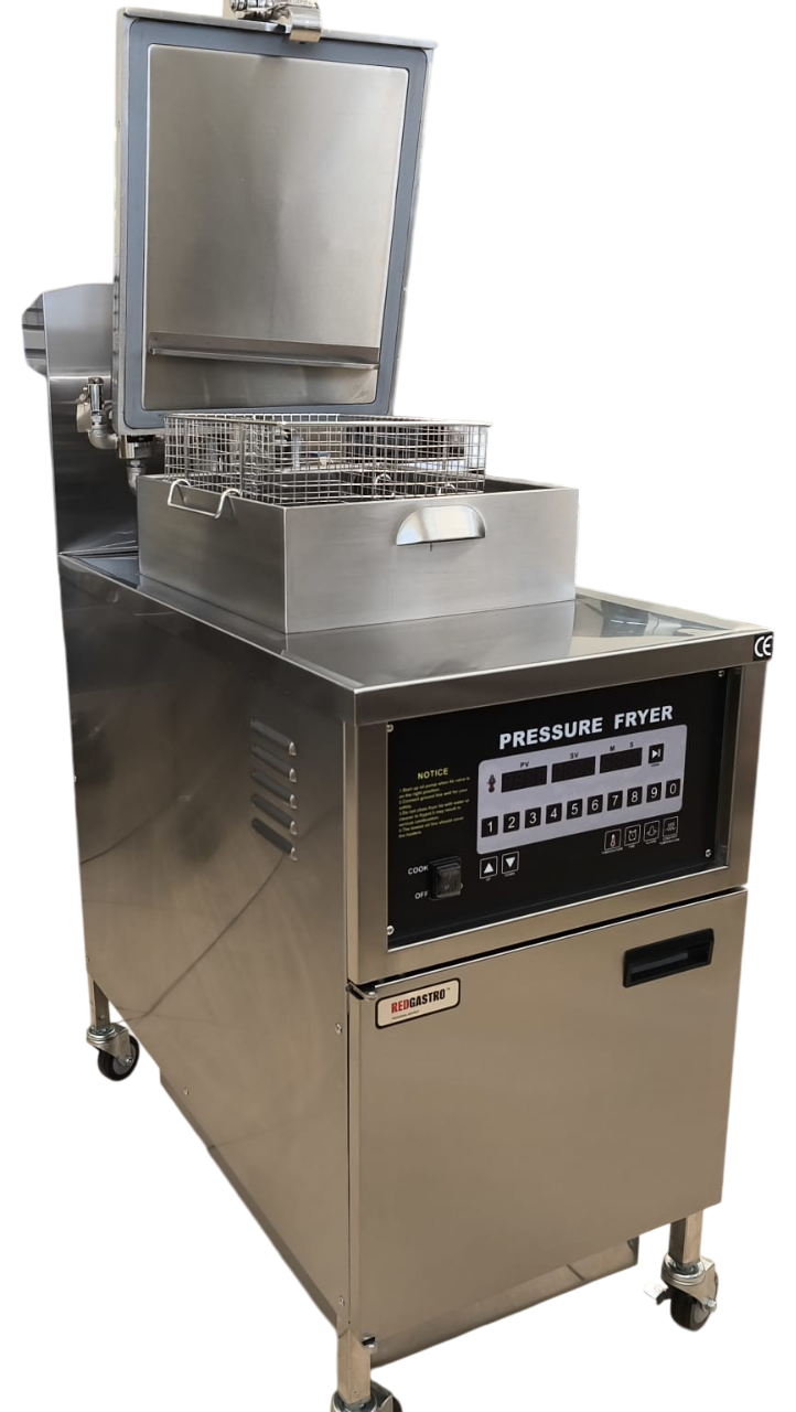 Фритюрница под давлением REDGASTRO MDXZ-24D предназначена для жарки продуктов под давлением. Продукт погружается в предварительно подогретое масло, и крышка аппарата герметично закрывается. Давление в рабочей зоне составляет около 1 атм. В самом начале процесса обработки из пищевых продуктов испаряется небольшое количество влаги. Ее дальнейшему высвобождению препятствует избыточное давление, которое помогает сохранить натуральные соки и предотвратить поглощение продуктом масла.