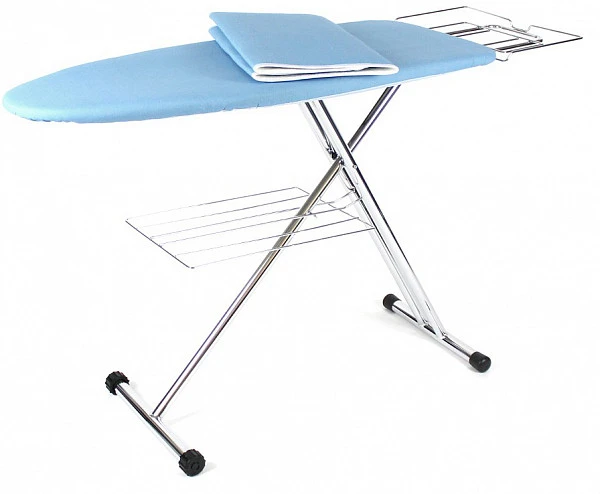 Полочка большая и вмещает много вещей. Металлические детали доски сделаны с применением антикоррозийной обработки, а ножки, подставки и полочка имеют хромированное покрытие.