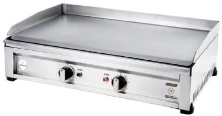 Оснащен открытой жарочной поверхностью с бортами, устойчивыми нескользящими опорами и электромеханической панелью управления.