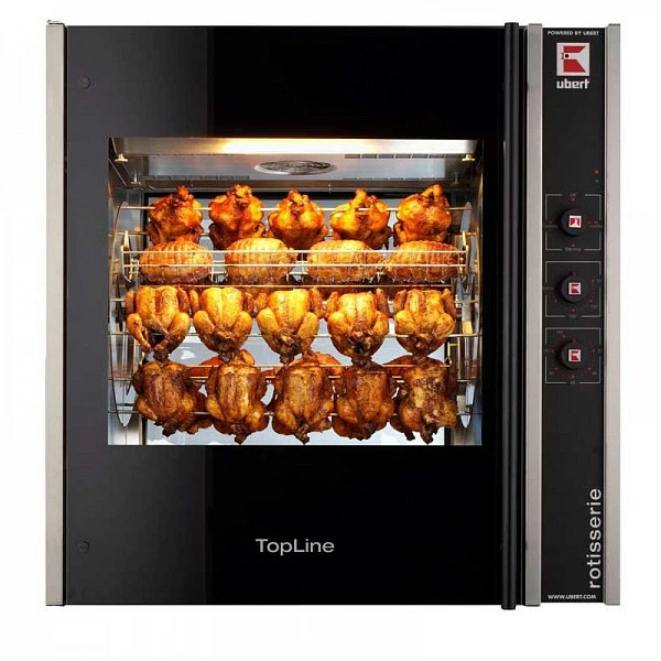 Гриль для кур Ubert RT 404 предназначен для использования в ресторанах быстрого питания, супермаркетах и уличной торговле для жарки цыплят, куриных окорочков, крылышек и грудок.