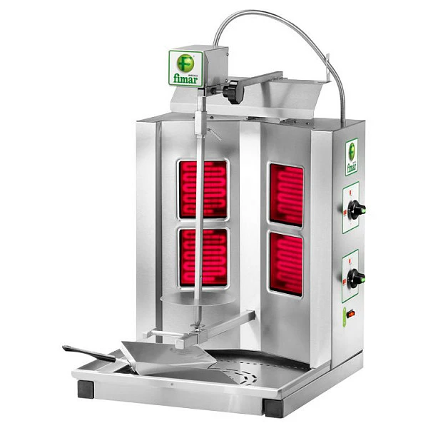 Fimar GYR 40 - профессиональное оборудование, подходящее для готовки шаурмы, кебаба и других блюд из мяса на вертеле. Удобный и компактный аппарат сделает изготовление шаурмы простым и легким. Данная модель нужна для приготовления больших объем мяса на вертеле. За один раз на шампуре можно разместить до 10 килограмм.