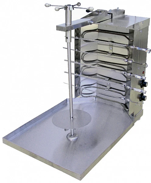 Принцип действия заключается в том, что мясное филе, приготовленное по специальному рецепту, насаживается на вертикальный шампур, который вращается вокруг своей оси около электрических тэнов.