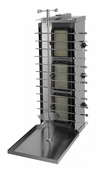 Принцип действия заключается в том, что мясное филе, приготовленное по специальному рецепту, насаживается на вертикальный шампур, который вращается вокруг своей оси около электрических тэнов.