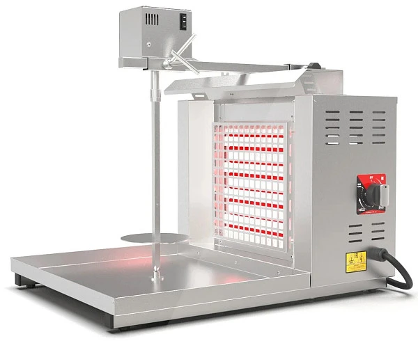 Отличительной особенностью данной модели является электрический привод вращения вертела, что делает процесс приготовления мяса более автоматизированным и позволяет равномерно прожаривать мясо со всех сторон.