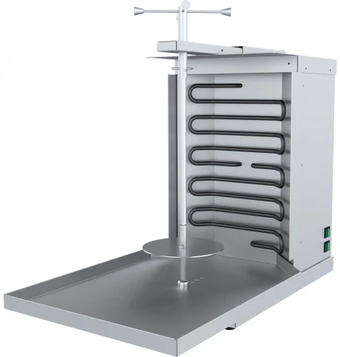 Гриль для шаурмы ПищТех ШШЭ-2-М предназначен для быстрого приготовления мясной начинки для блюд «Шаверма» (разрезанная булочка с мелко нарезанным, поджаренным на установке мясом с приправой) на предприятиях общественного питания.