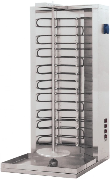 Технология обжаривания мяса с использованием этого гриля для шаурмы предполагает нанизывание вырезки на нож, расположенный вертикально и вращающейся вокруг своей оси в непосредственной близости от нагревательных элементов, что позволяет добиться качественного прожаривания и исключить пригорания.