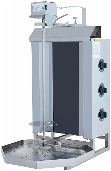 Равномерное приготовление мяса происходит, благодаря вращению заготовки вокруг своей оси напротив нагревательных элементов. По мере готовности, прожаренный слой мяса срезается электрическим или обычным ножом.