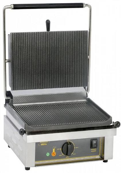 Гриль контактный Roller Grill Panini R с рифлеными чугунными поверхностями предназначен для использования предназначен для жарки мяса, птицы, рыбы, овощей, а также для приготовления стейков, гамбургеров и горячих сэндвичей на предприятиях общественного питания и торговли, специализирующихся на приготовлении фаст фуда.