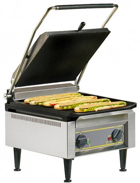 Гриль контактный Roller Grill Panini XL R с рифлеными чугунными поверхностями предназначен для использования предназначен для жарки мяса, птицы, рыбы, овощей, а также для приготовления стейков, гамбургеров и горячих сэндвичей на предприятиях общественного питания и торговли, специализирующихся на приготовлении фаст фуда.