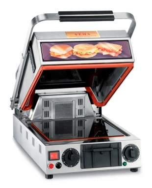 Гриль контактный Vema PF2097/1 отлично подходит для приготовления любых продуктов, таких как бутерброды, мясо, рыба, овощи, пицца, размещенных на ребристых керамических нагревательных поверхностях.
