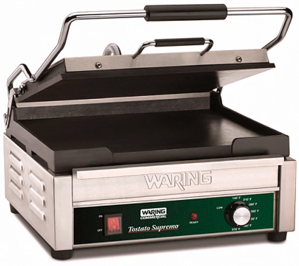 Гриль контактный Waring WFG250E идеально подходит для приготовления жареных сэндвичей с панини, гамбургеров, курицы, овощей и многого другого на гриле в итальянском стиле на предприятиях общественного питания и торговли.