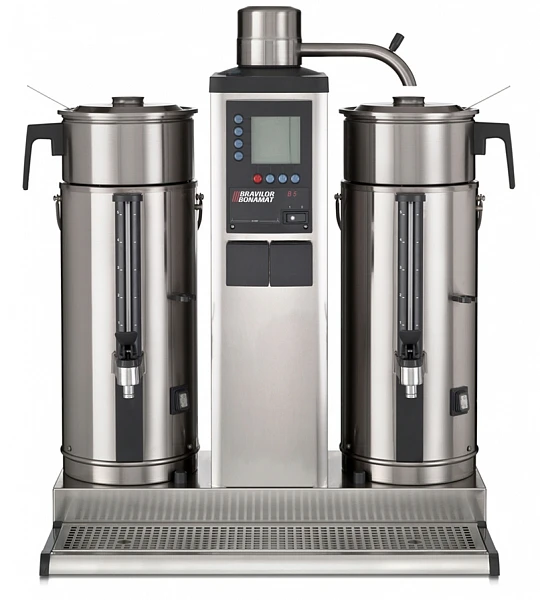 Капельная кофеварка Bravilor Bonamat B5 (220В) используется на предприятиях общественного питания и торговли для приготовления фильтрованного кофе. Модель оснащена цифровым дисплеем, системой кофеварения, 2 емкостями для кофе с подогревом, 2 заварными чашами, индикаторами заполнения, готовности кофе и удаления накипи и поддоном для капель. Корпус выполнен из нержавеющей стали.