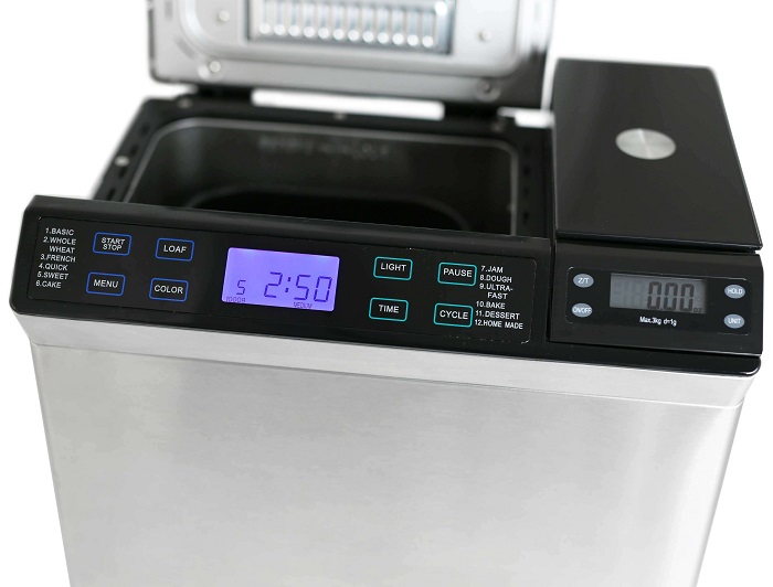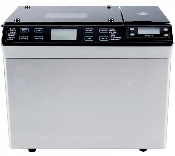 В комплект поставки входит мерная ложка, мерный стакан, лопасть для замеса теста и дозатор, который позволяет в процессе замеса добавлять в тесто орехи и сухофрукты, а также электронные весы для взвешивания ингредиентов.
