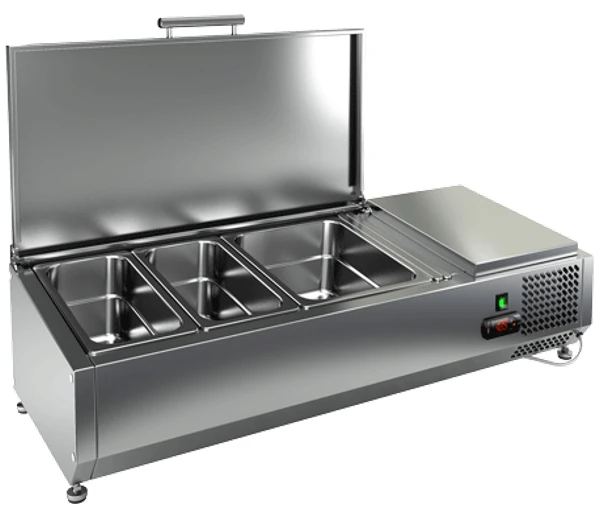 Холодильная витрина для ингредиентов Hicold VRTU 1390 с крышкой предназначена для кратковременного хранения ингредиентов при приготовлении пиццы и салатов, а так же демонстрации и продажи предварительно охлажденных пищевых продуктов в гастрономических ёмкостях на предприятиях торговли и общественного питания.