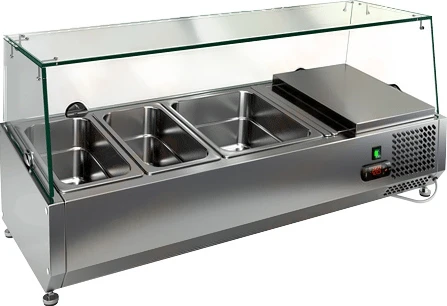 Холодильная витрина для ингредиентов Hicold VRX 1200 со стеклом предназначена для кратковременного хранения ингредиентов при приготовлении пиццы и салатов, а так же демонстрации и продажи предварительно охлажденных пищевых продуктов в гастрономических ёмкостях на предприятиях торговли и общественного питания.