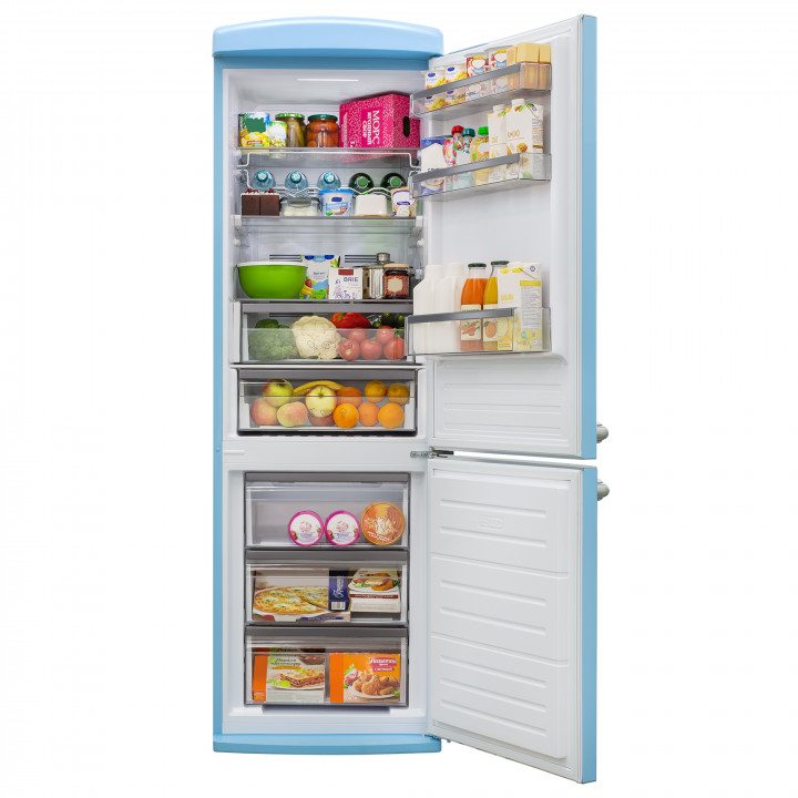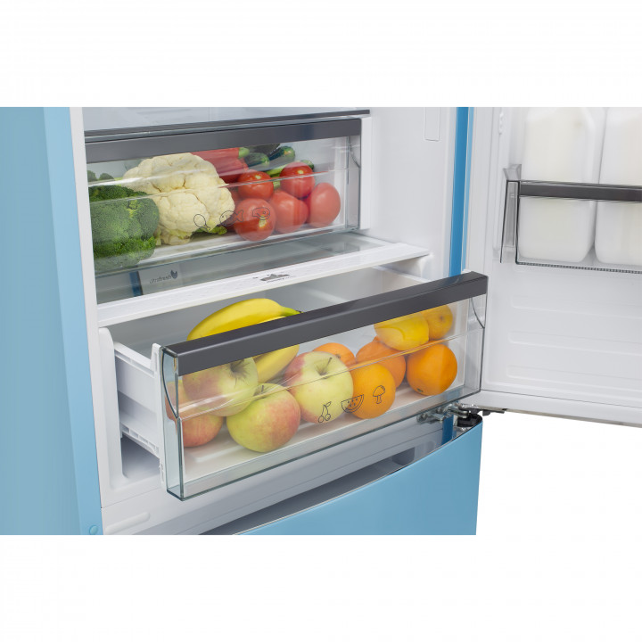 Холодильник оснащен тремя полками из закаленного стекла, одна из которых складная, ящиками для фруктов и овощей внутри холодильной камеры, а также тремя ящиками для продуктов в морозильной камере.