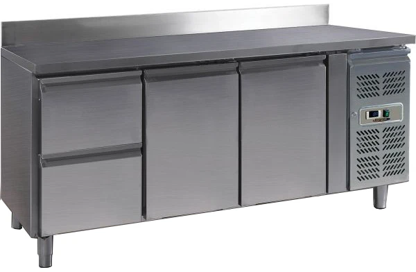 Стол холодильный, гастронормированный (GN1/1), с 2 ящиками и 2 распашными, самозакрывающимися, глухими дверями, бортом, правым агрегатом, для хранения пищевых продуктов, изготовлен из нержавеющей стали.