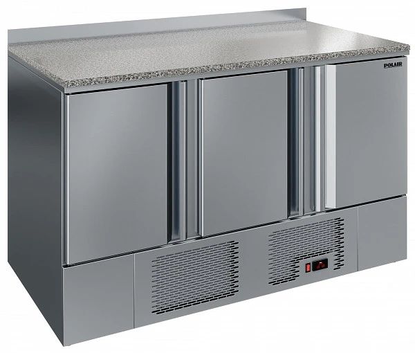 Холодильный стол Polair TMi3GN-G гранит - компактный стол, сочетающий в себе холодильный шкаф с существенным объемом хранения и рабочую поверхность из натурального гранита - идеальное решение для небольшого помещения кондитерской, пекарни, пиццерии и т.п. Гранитная столешница оптимальна для работы с различными видами теста, шоколадом, мороженым и т.п.