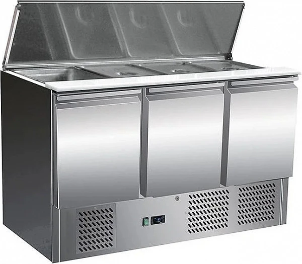 Холодильный стол Viatto S903SEC ппредназначен для разделки продуктов для приготовления салатов и начинки для пиццы, а также для кратковременного хранения охлаждённых ингредиентов. Отличается компактными размерами, что позволяет разместить его на небольшой кухне. Холодильный агрегат расположен снизу. Корпус и камера изготовлены из нержавеющей стали, разделочная доска – из пластика. В столешнице есть гнездо для установки 4 гастроёмкостей GN 1/1.