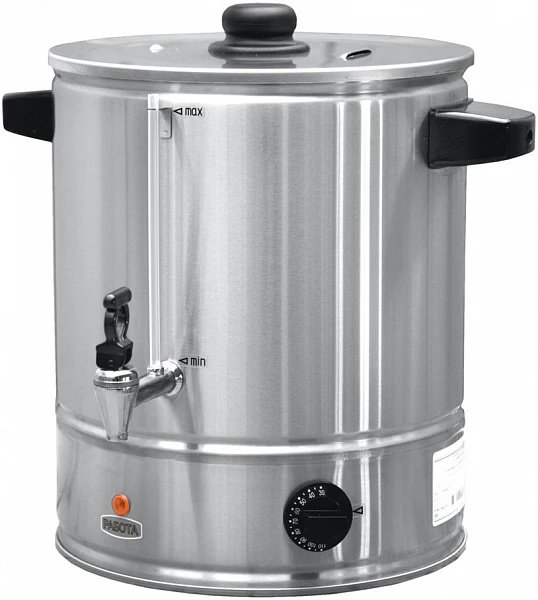 Кипятильник оснащен индикатором включения ТЭНов, сливным краном и указателем уровня воды, крышкой.