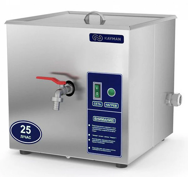Кипятильник Kayman КЭ-01-25 А предназначен для непрерывного приготовления кипятка на предприятиях общественного питания. Горячая вода (кипяток), произведенная в кипятильнике, применяется при варке гарниров, овощей, сосисок, пельменей, при изготовлении горячих напитков и т. д. Кипяток может использоваться для стерилизации кухонной и столовой посуды, столовых приборов.