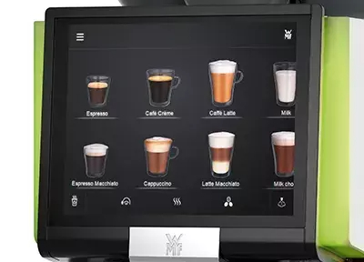 WMF 5000 S+ имеет привлекательный интерактивный 10-дюймовый цветной сенсорный дисплей с реальными изображениями продуктов и индивидуальными цветовыми схемами. Навигация интуитивно понятна как для официантов, так и для самообслуживания с помощью привычных жестов касания и пролистывания. Дисплей идеально подходит для отображения информации о продуктах, а также может использоваться для воспроизведения видеороликов, например, для продвижения специальных акций в определенное время дня.