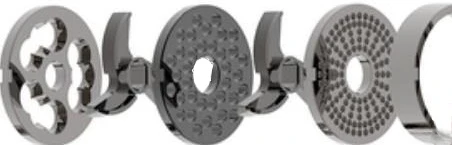 Комплект состоит из двух ножей и трех решеток и прижимного кольца, изготовленных из нержавеющей стали.