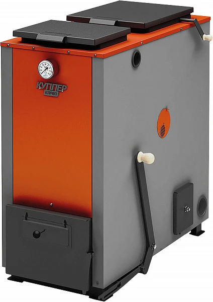 Котел твердотопливный Теплодар КУППЕР КАРБО-26 используется для обогрева частных домов, гаражей, дач и других помещений, оборудованных системой водяного отопления с естественной или принудительной циркуляцией теплоносителя. Модель имеет шахтную конструкцию с загрузочной зоной, зоной горения и зоной теплообмена. Корпус котла выполнен из качественной конструкционной стали, боковые поверхности корпуса водяной рубашки теплоизолированы базальтовым картоном и облицованы декоративными панелями с полимерным покрытием, колосник - из чугуна.